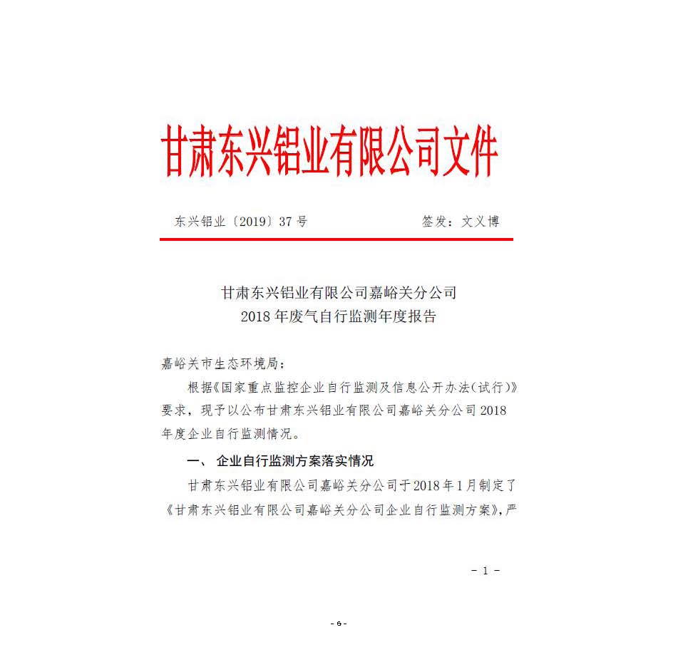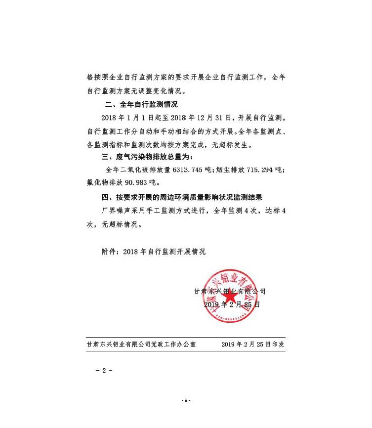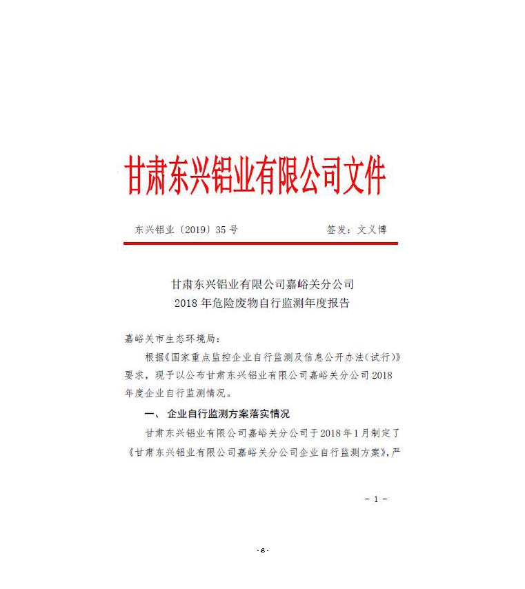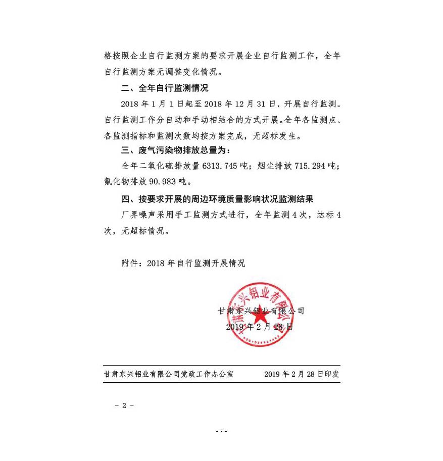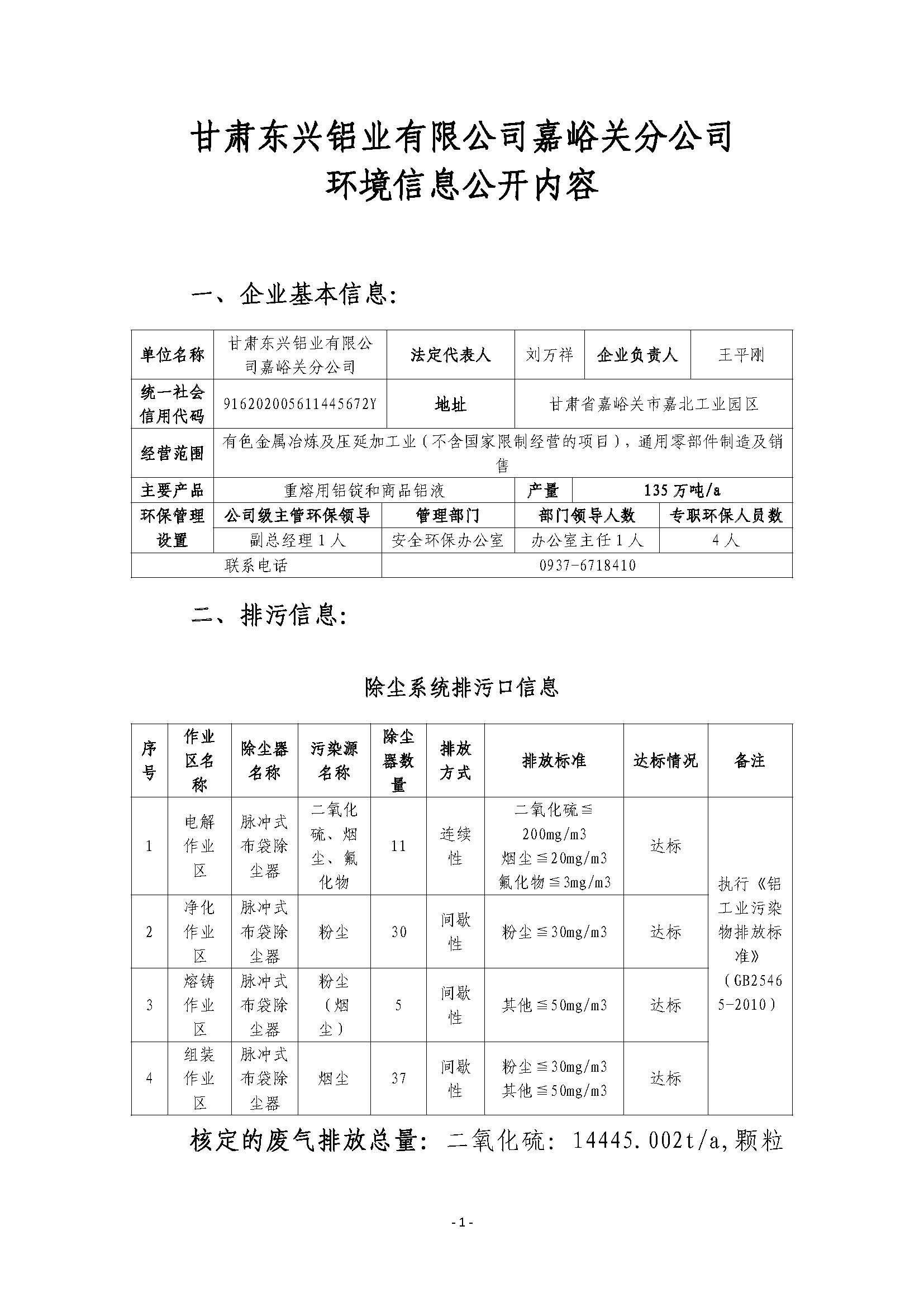 甘肅東興鋁業(yè)有限公司嘉峪關分公司2019年度環(huán)境信息公開