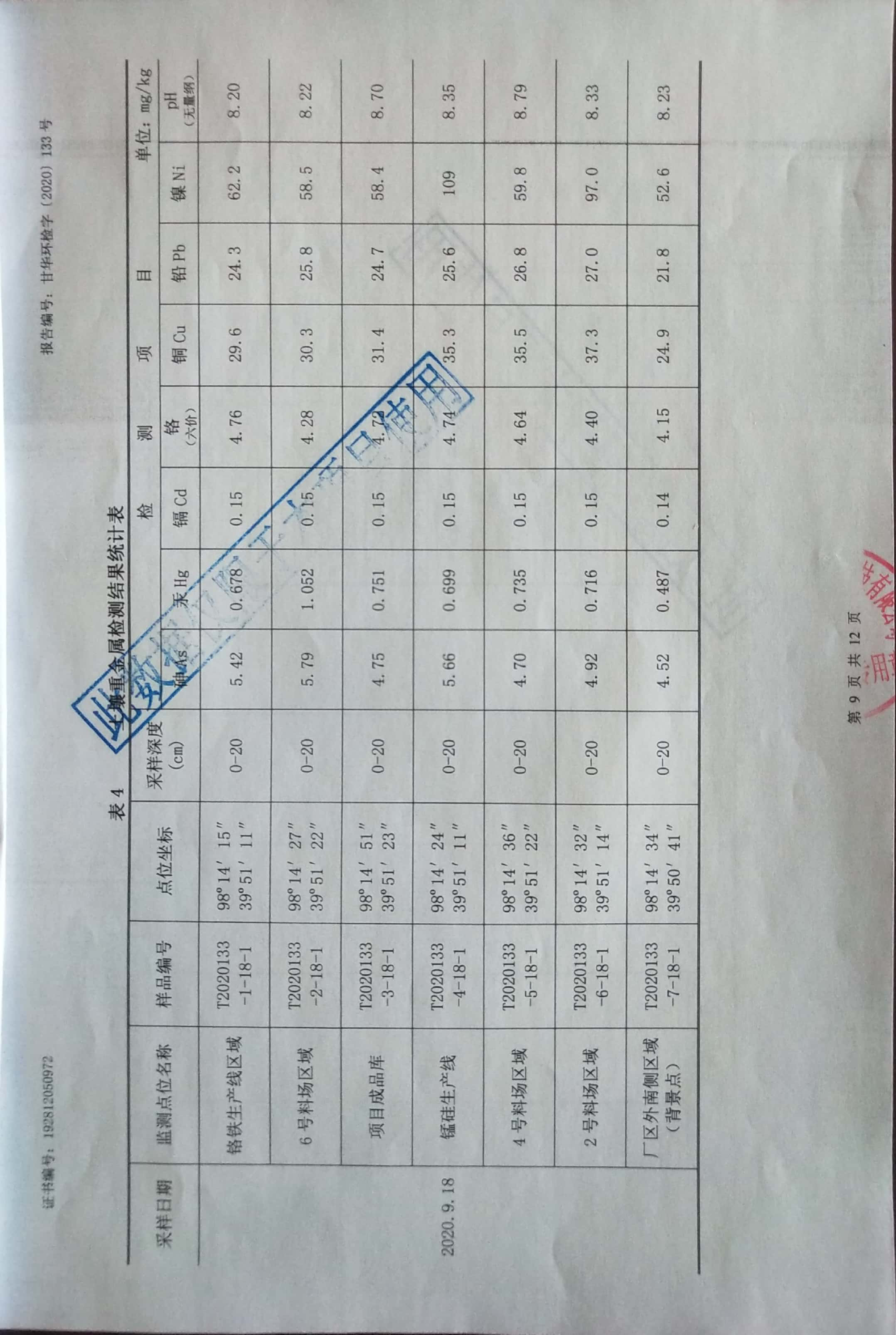| 監(jiān)測(cè)時(shí)間 | 2020年9月18日 | 監(jiān)測(cè)項(xiàng)目 | PH、鎘、汞、砷、銅、鉛、鉻、鎳、鋅、陽離子交換量 | |