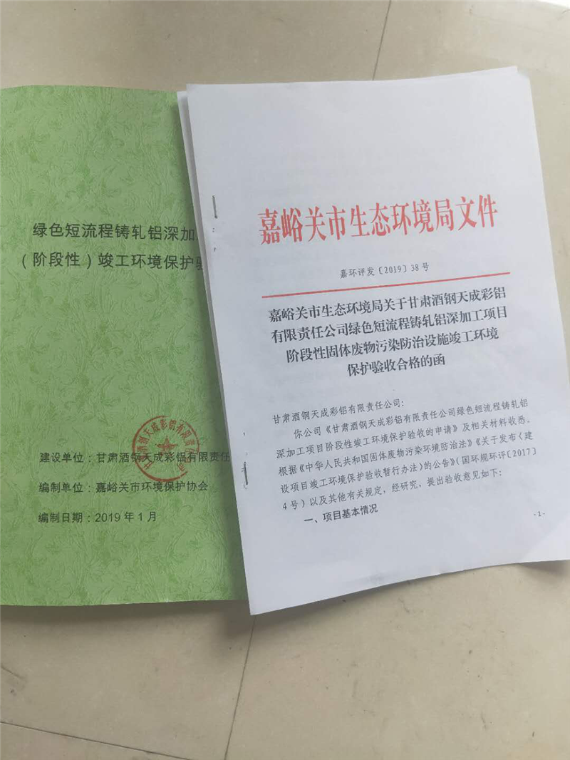 我公司環(huán)境影響報(bào)告書均通過省生態(tài)環(huán)境廳與市生態(tài)環(huán)境局審批,于2016年11月2日取得《嘉峪關(guān)市環(huán)境保護(hù)局關(guān)于酒鋼天成彩鋁有限責(zé)任公司綠色短流程鑄軋鋁深加工項(xiàng)目環(huán)境影響報(bào)告書的批復(fù)》嘉環(huán)評【2016】132號。并在2019年3月4日通過環(huán)保建設(shè)項(xiàng)目“三同時(shí)”(階段性)驗(yàn)收,并取得環(huán)境保護(hù)驗(yàn)收合格函。