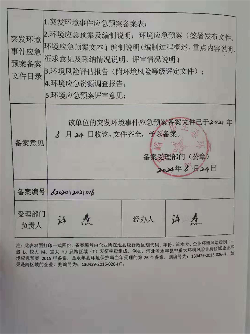 3.風(fēng)險(xiǎn)級別:[較大-大氣(Q1-M4-E3)+一般-水(Q1-M1-E3)]于2021年6月24日通過嘉峪關(guān)市生態(tài)環(huán)境局備案。