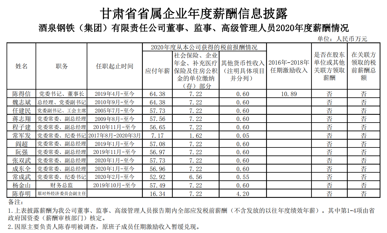 酒泉鋼鐵(集團)有限責任公司董事、監(jiān)事、高級管理人員2020年度薪酬情況
