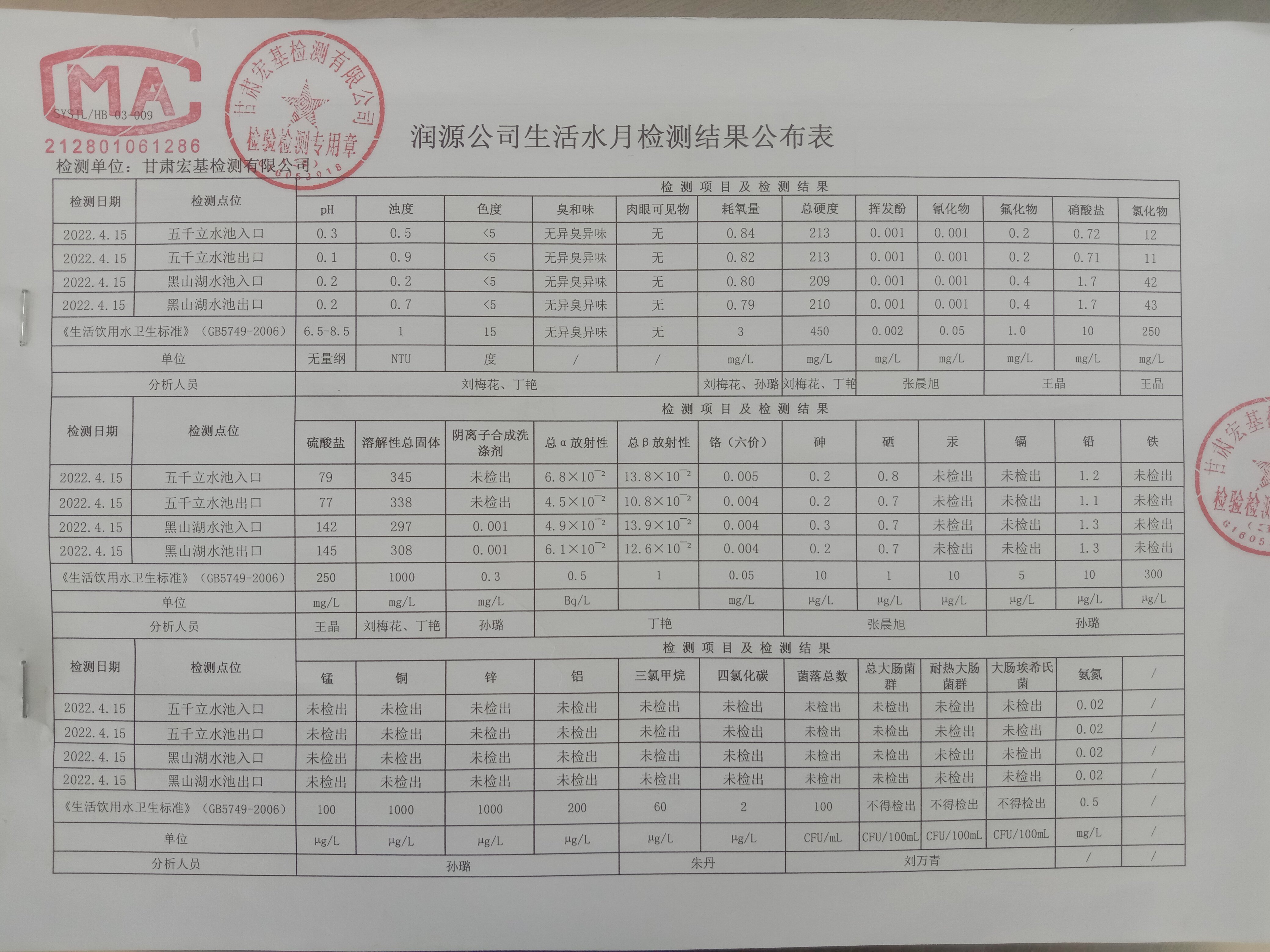 甘肅潤(rùn)源環(huán)境資源科技有限公司水源地水質(zhì)二季度公示
